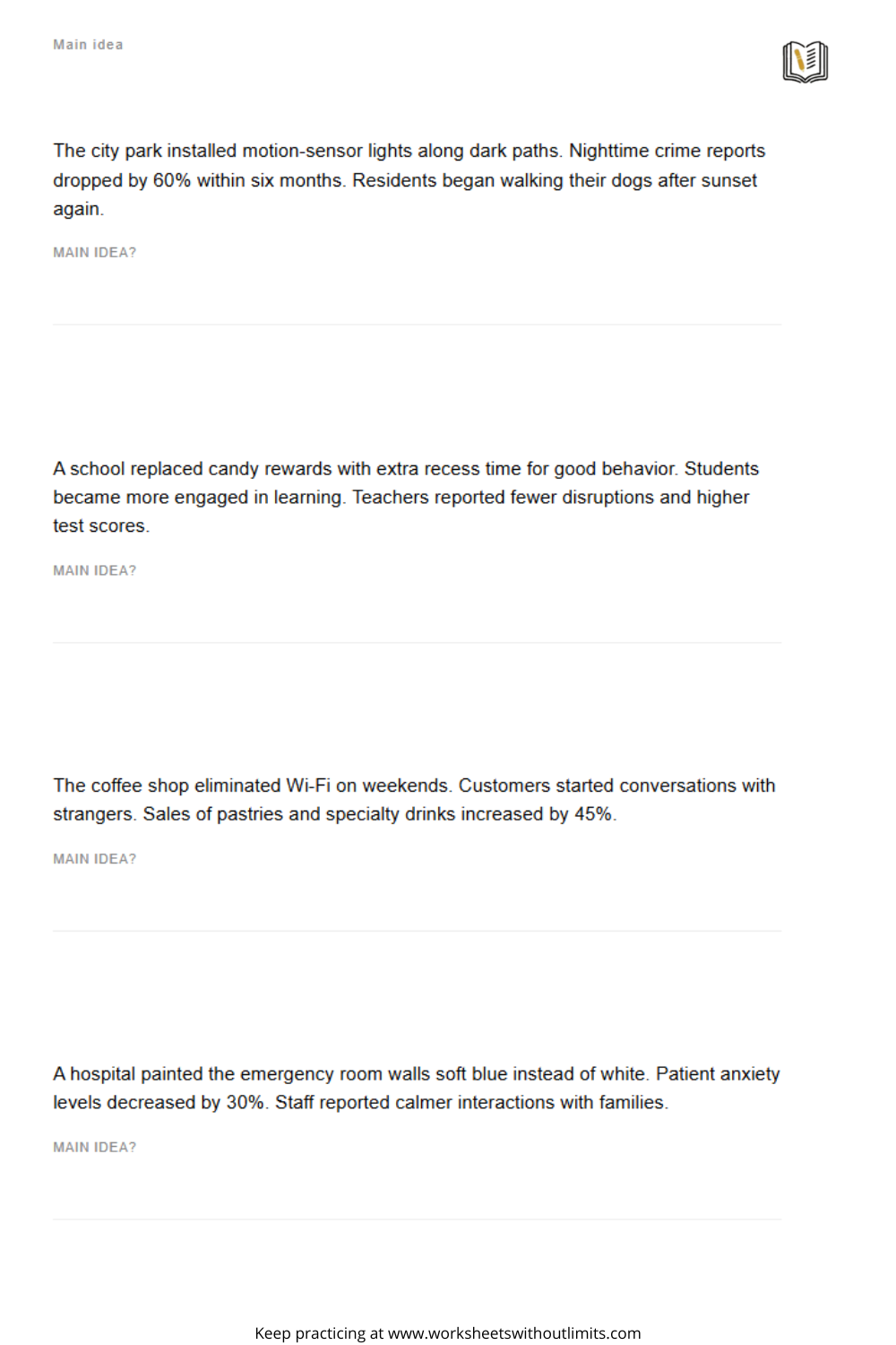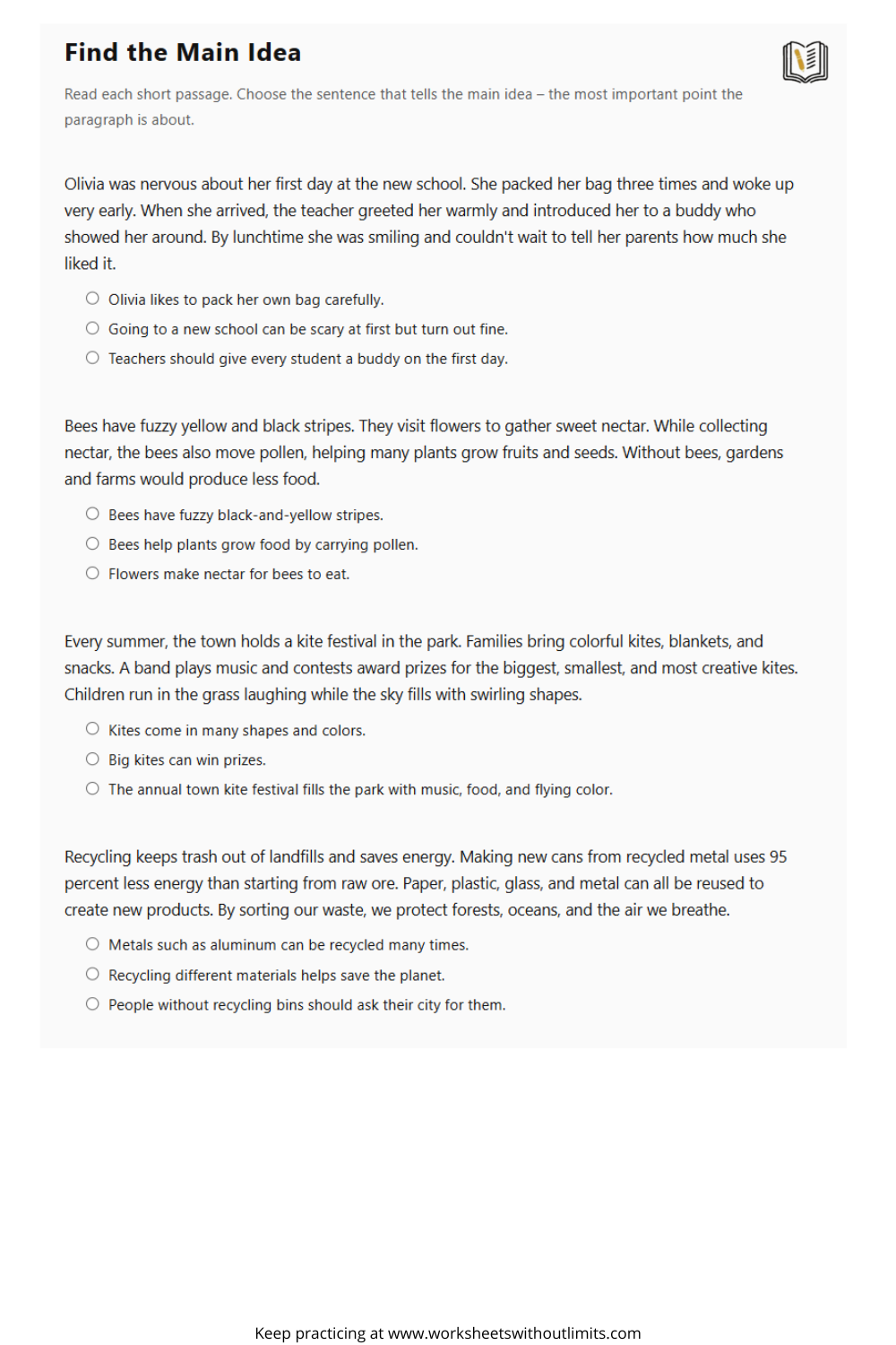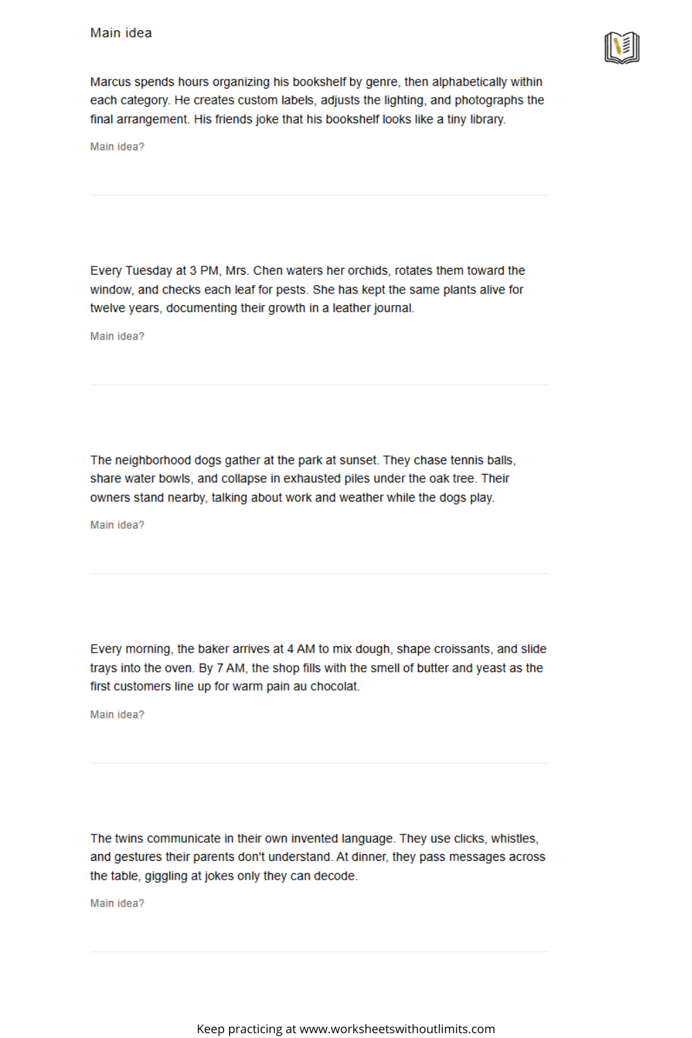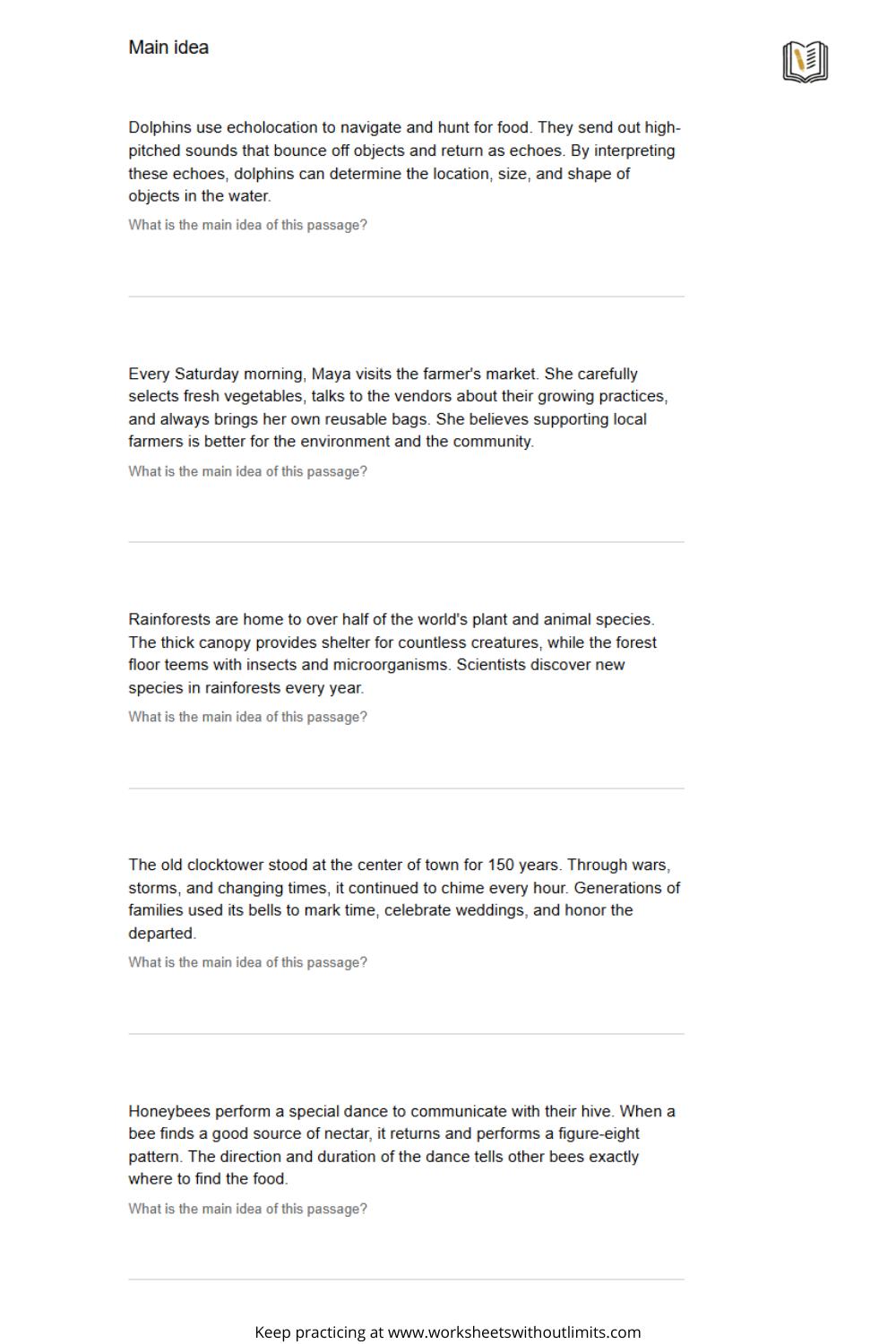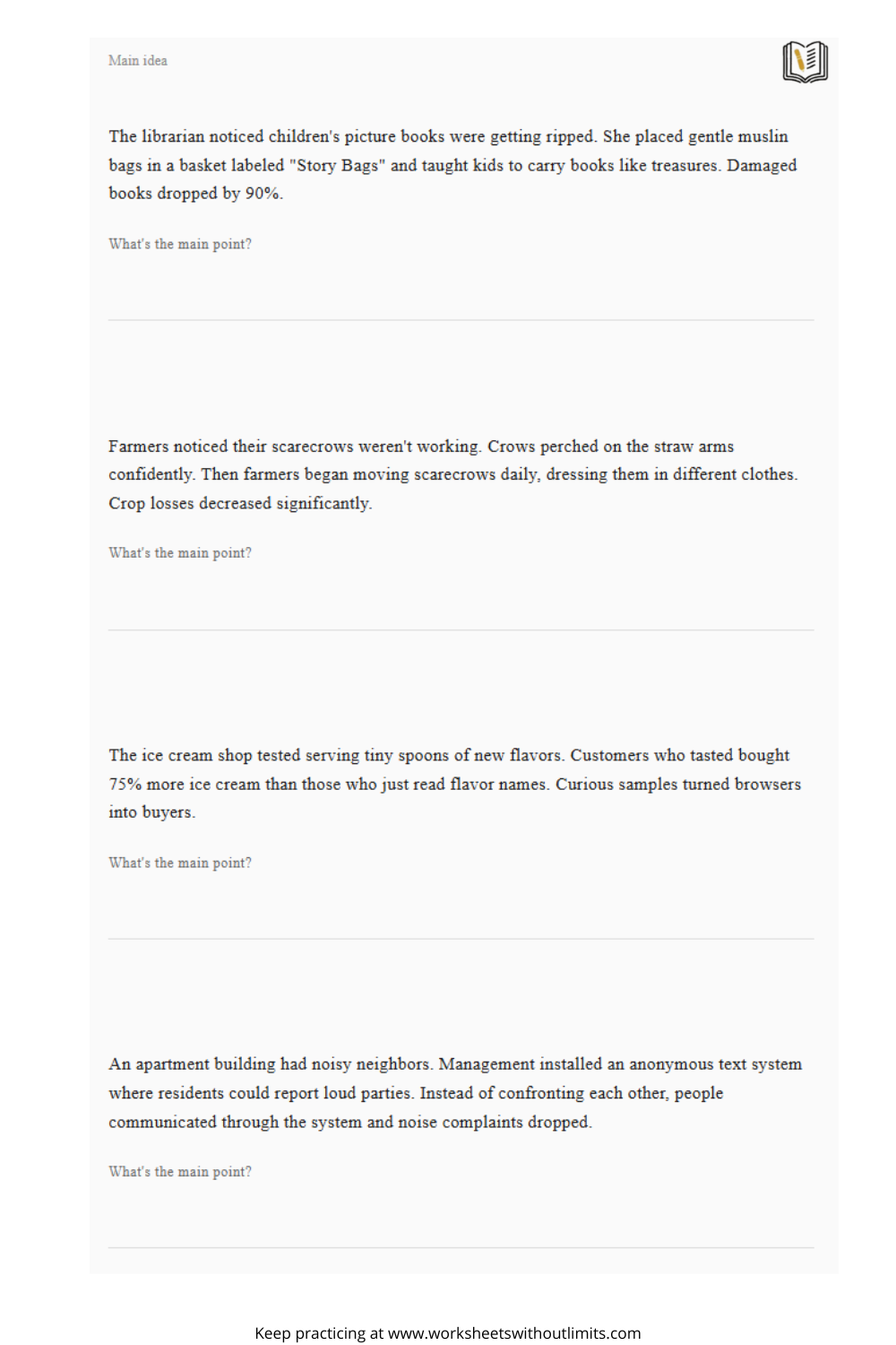 Like any skill, identifying the main idea takes repetition. Use worksheets consistently for gradual improvement.