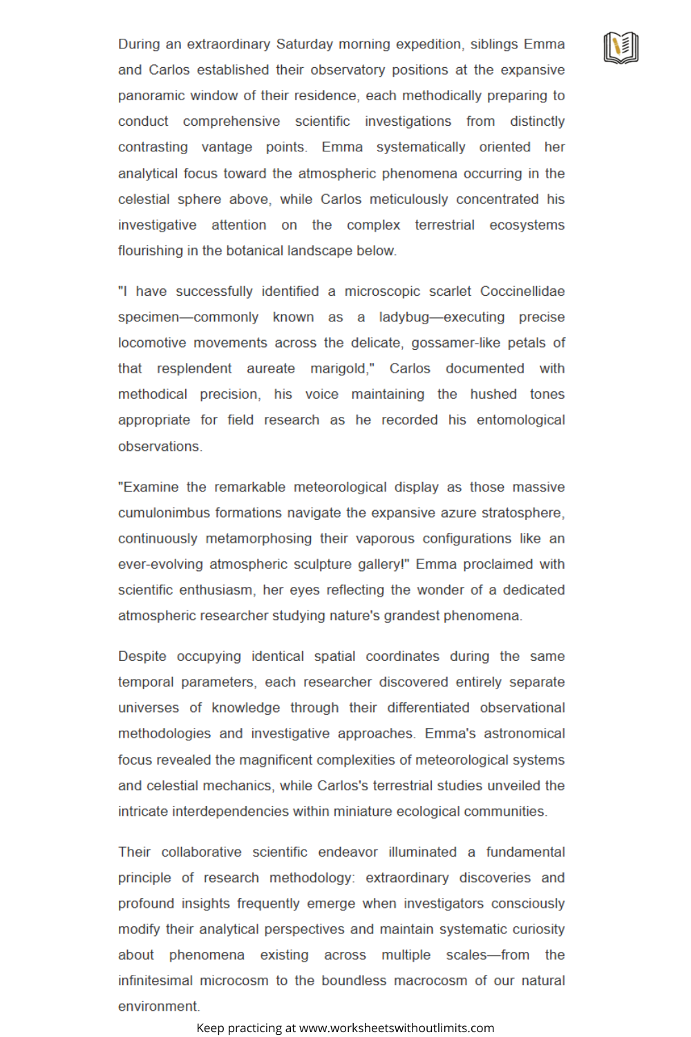 Read a passage together and verbalize your thought process—how you infer meaning, notice clues, or connect ideas.