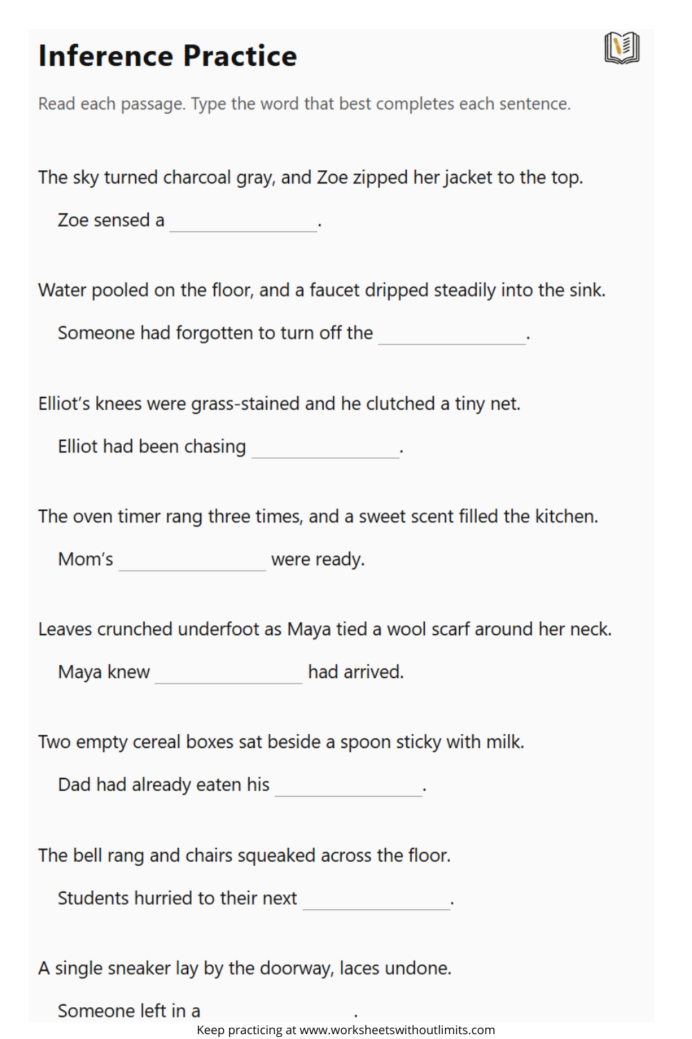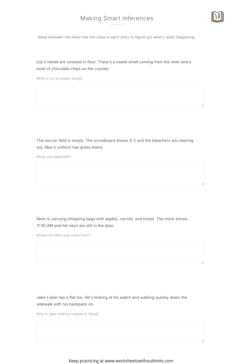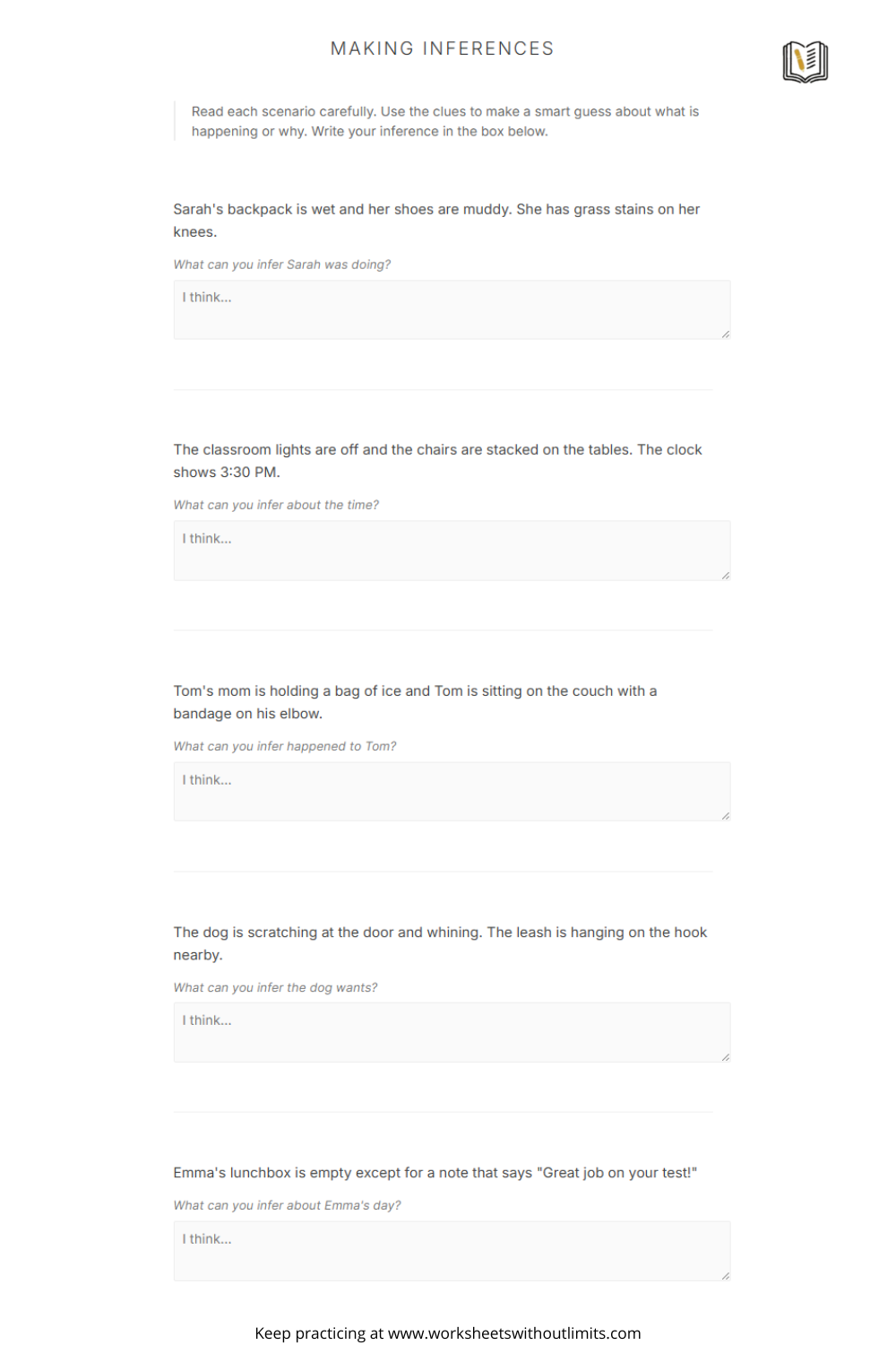 Our making inferences worksheets give students regular practice with this skill by presenting short passages followed by questions that require thoughtful interpretation.