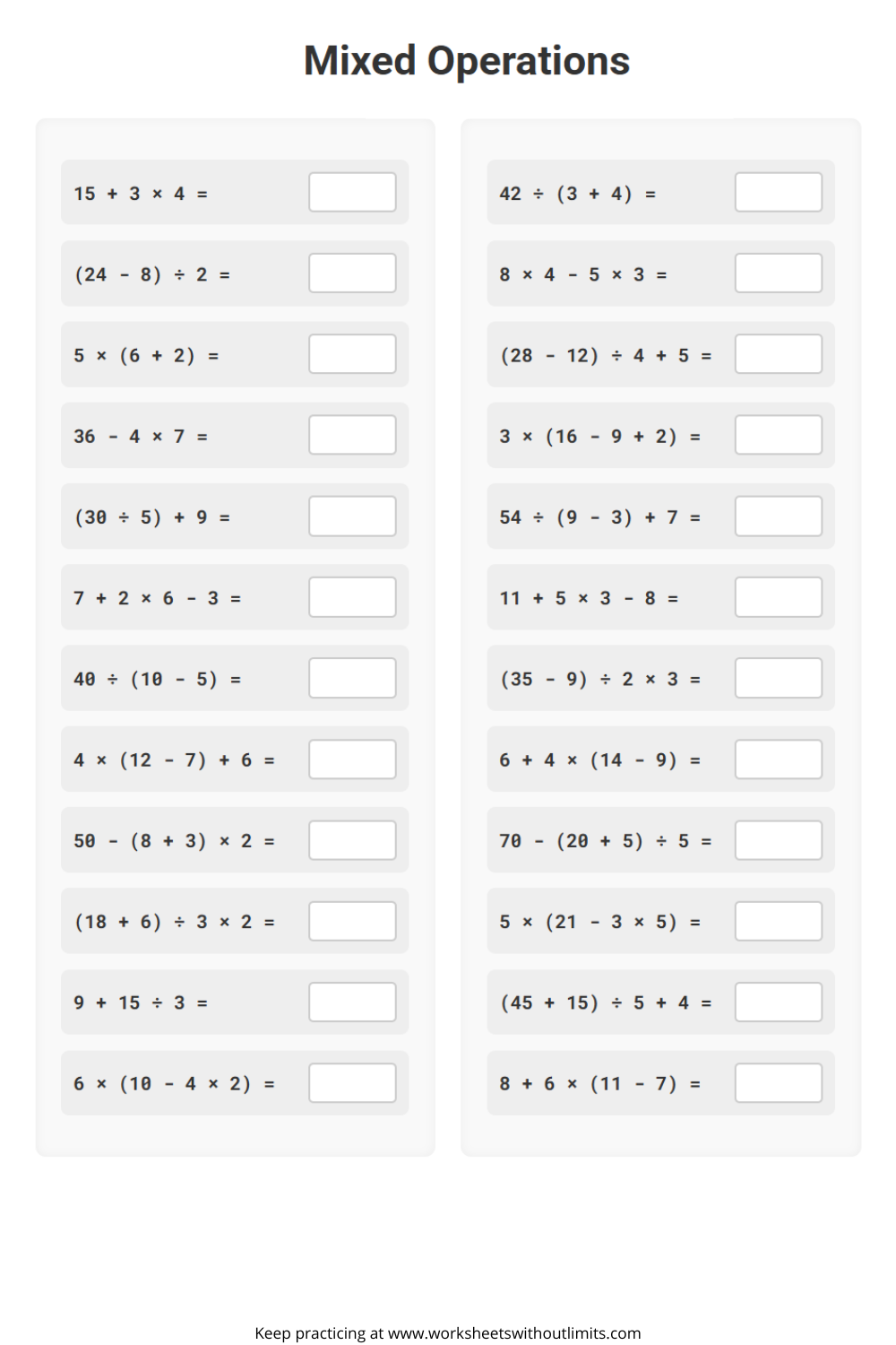 Welcome to a full collection of order of operations worksheets for 5th grade, available as downloadable PDFs or digital activities. These are designed to help students understand and apply the PEMDAS rule accurately when solving multi-step math problems.